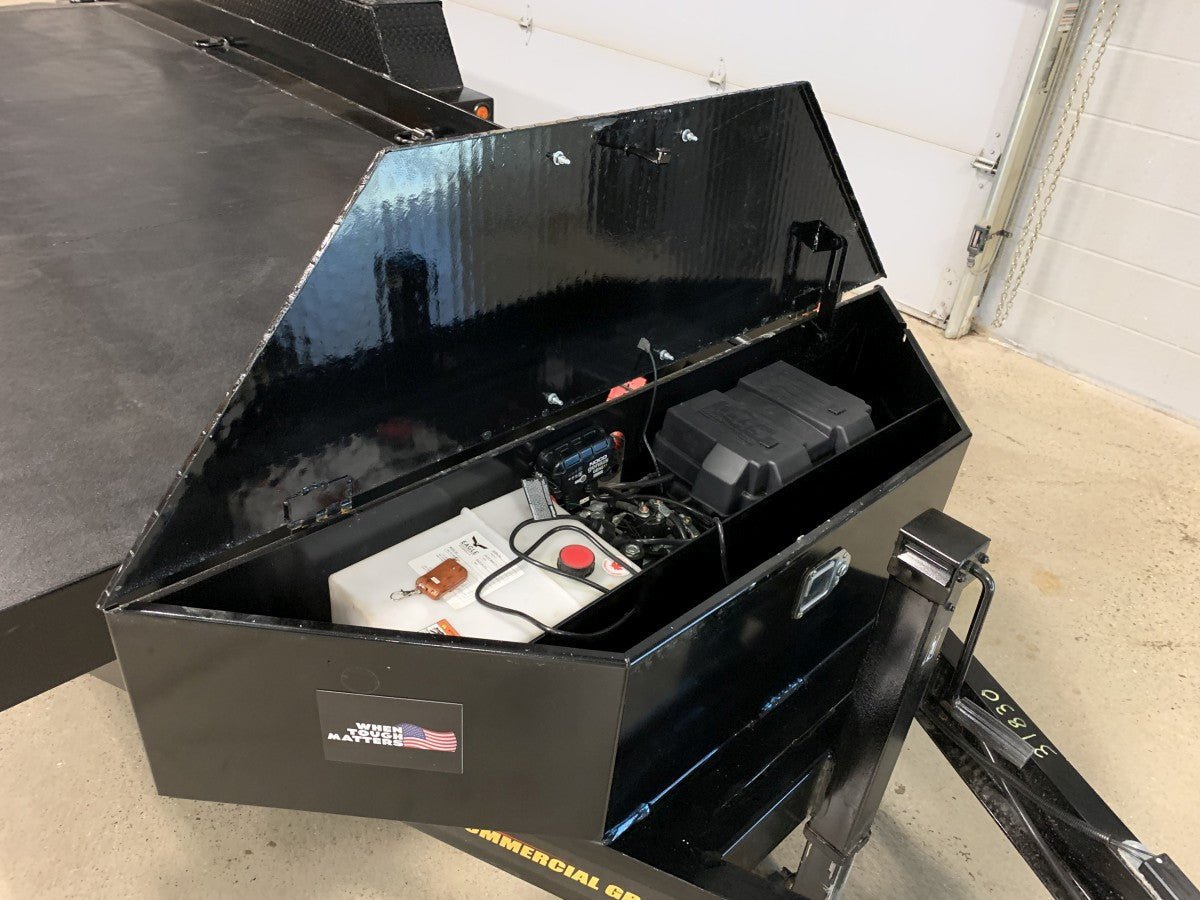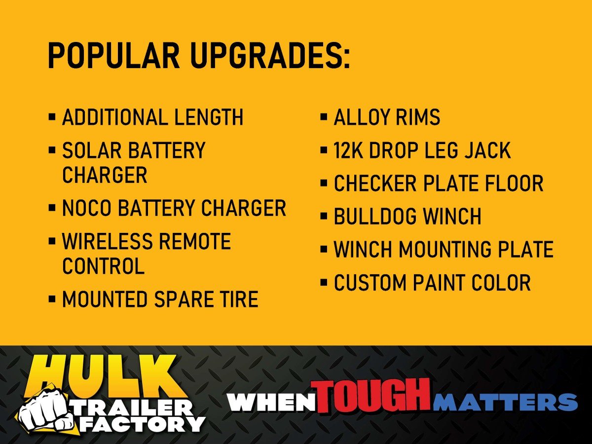 Trailer shown with optional Alloy Wheels, Wireless Controller, Solar Charger, Noco Battery Charger, and Bulldog Winch on Winch Plate