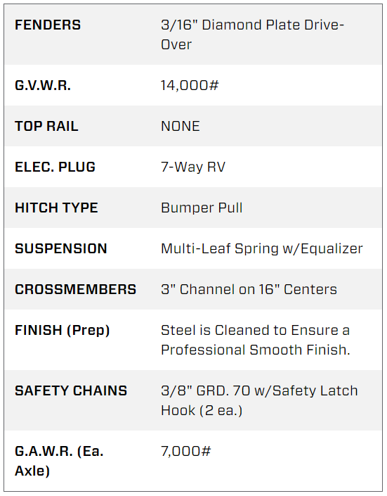 The 14DF Pro Series Equipment Trailer features a full-width deck, as well as heavy-duty 3/16-inch diamond plate steel drive-over fenders. An internal 6-inch structural channel iron frame makes the 14DF durable and strong enough for any haul.