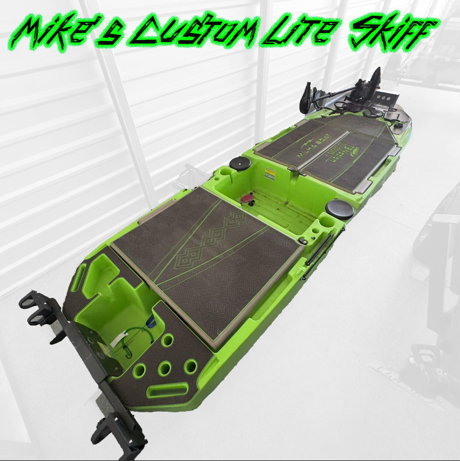 - Modified transom with micro anchor mounts and transducer mount.